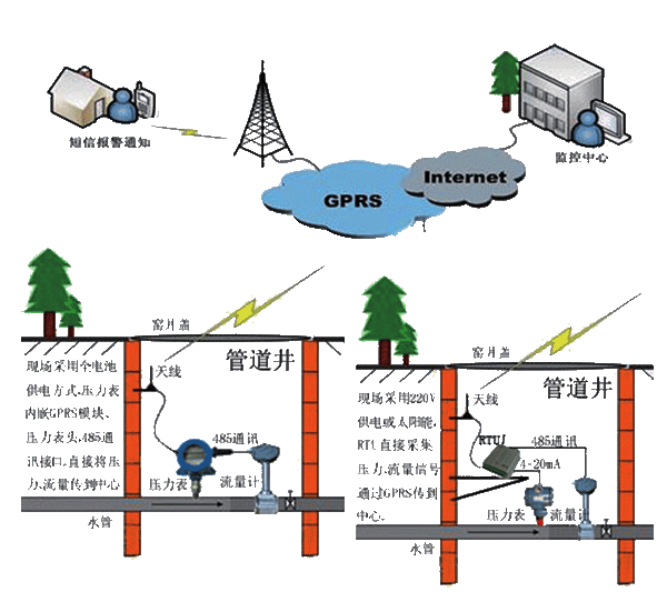 一、系統(tǒng)簡介 為保證供水工作的科學性,依靠現(xiàn)代計算機通信技術(shù)和傳感技術(shù),實施對供水管道的無人化遠程實時監(jiān)測,并且能夠自動傳輸?shù)缴厦娓骷壷鞴懿块T,監(jiān)測輸水管道、城市供水管道的壓力、流量信息;及時發(fā)現(xiàn)管網(wǎng)故障,提高維護效率、降低損失,保障輸水、供水質(zhì)量,達到科學預(yù)警,減少成本,提高效率的目的。 二、系統(tǒng)組成 v 監(jiān)控中心:中心服務(wù)器、外網(wǎng)固定IP、管網(wǎng)系統(tǒng)軟件; v 通信網(wǎng)絡(luò):基于移動GPRS或者電信CDMA的通信網(wǎng)絡(luò)平臺; v 采集終端:無線壓力表/低功耗遙測終端BTU; v 測量儀表:流量計/脈沖水表、壓力變送器、報警設(shè)備等; v 供電方式:電池供電、太陽能供電、市電。